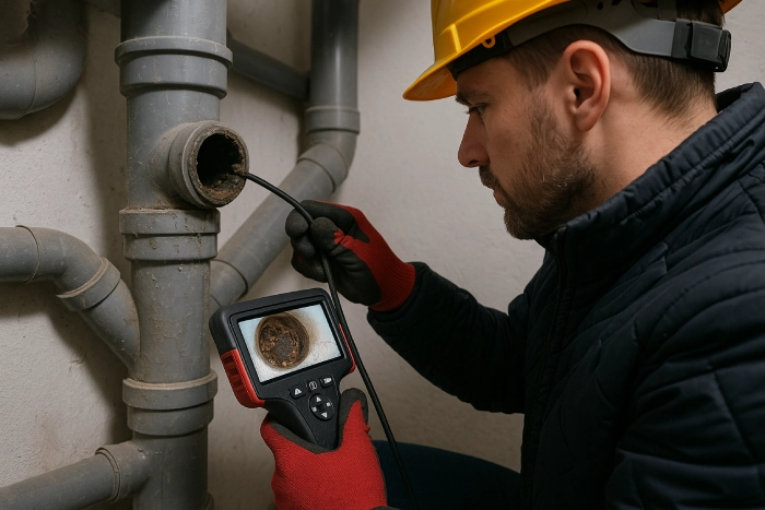 Intervención realizada en una comunidad de propietarios que presentaba atascos recurrentes en la bajante principal del edificio, provocando malos olores y lentitud en el desagüe de cocinas y baños. Se comenzó con una inspección mediante cámara CCTV para localizar el punto crítico de obstrucción y evaluar el estado interno de la tubería.