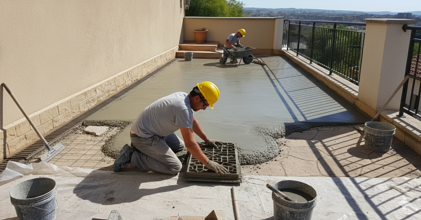Intervención realizada en una amplia terraza exterior que presentaba desgaste, irregularidades y zonas erosionadas por el paso del tiempo y la exposición continua al sol y la lluvia. El proyecto comenzó con la preparación del terreno, nivelación de la superficie y ejecución de una base sólida que garantizara estabilidad y durabilidad del pavimento final.